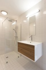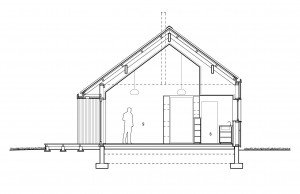 The timber frame construction, allowed for highly insulated walls and roof, with the walls being constructed with 160mm of wood fiber insulation between structural framing members and an additional 60mm inside of this. The roof has been constructed with a significant 300mm wood fiber insulation. The exterior is finished with a larch siding installed vertically. The larch was chosen for its silver/grey tint as it weathers, helping the house blend with its landscape.