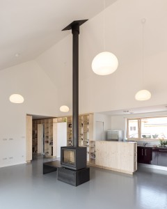 A double height open plan kitchen, living, dining space occupies the heart of the house, with a wood stove providing a warm and comforting focal point in the center of the space. The wood stove is augmented by the underfloor heating throughout the house. A garage and two large attic storage spaces supplement the functionality of this home.