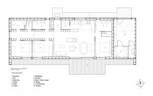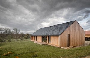 This private home is located in an old pasture just outside a village in Vezet in France. The 110sqm house was completed in 2013 for a construction cost of just over €200,000. The design for the house is a very simple volume that uses materiality to integrate itself into the surrounding rural landscape. A wooden deck sheltered by a roof overhang is located to the south, allowing the internal spaces flow out to the landscape. Largely glazed, the south facade maximizes solar gain in winter. The east front is blind, only the wood cladding is open to hide the heat pump. To the west, a non-operable window provides a visual connection between the internal spaces and the landscape, framing the view of the nearby village in the distance.