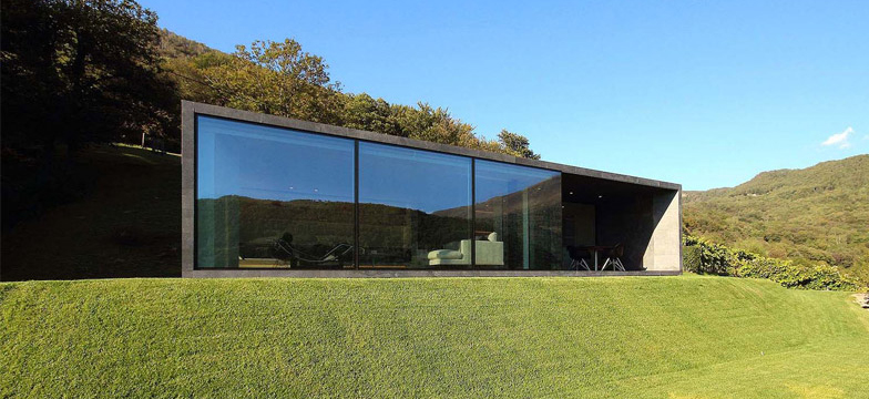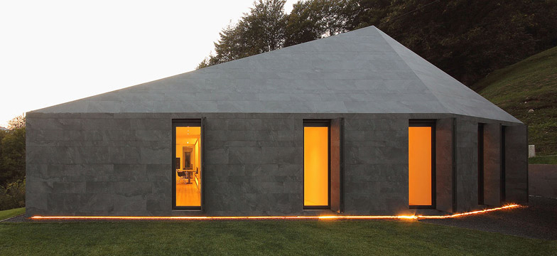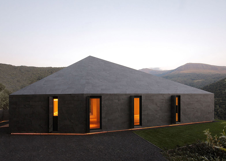 Clad in mottled grey tiles, the house sits on the edge of a slope above a valley ‘like a stone in the landscape’. Surrounded by cattle-grazing pastures and vineyards, its six-sided roof is angled to match the incline of the mountains and a glass curtain wall on its south side gives views over the valley. The house, designed by Milanese firm JM Architecture has a jagged form and colouring that were devised by the architect to help the home settle into its mountainous terrain.